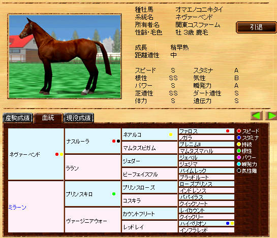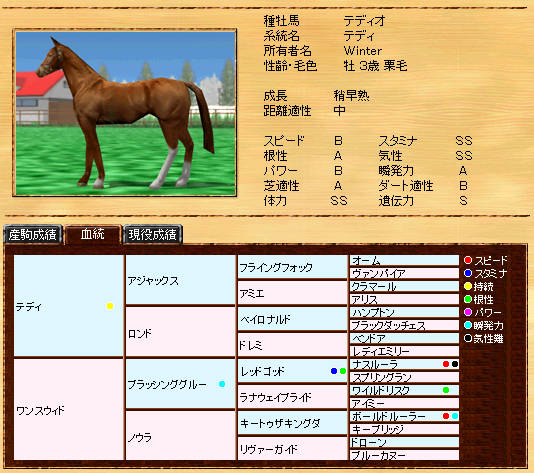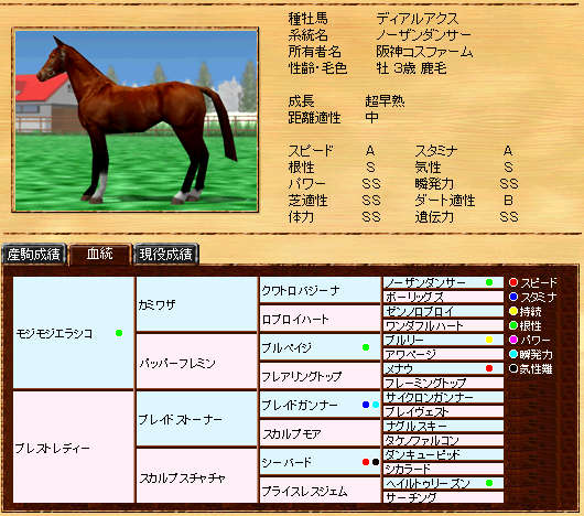 伸び悩んでいたリボー系メタボの自信作です。まだまだ発展途上ですが、種牡馬初年度の13Sは、なかなか安定した産駒を産出できていると思います。また、リボー系では珍しい?超早の短中です。