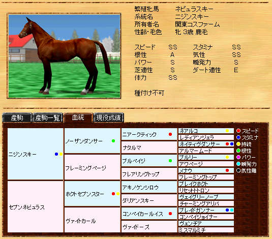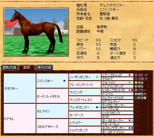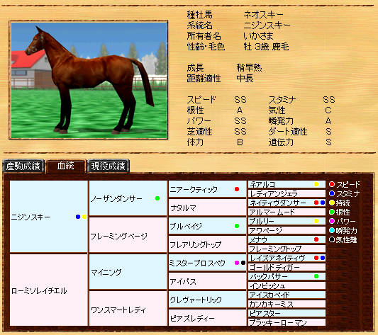 父ネオスキーより見劣りしますが、ニジンスキー系種牡馬としては、まずまずだと思います。