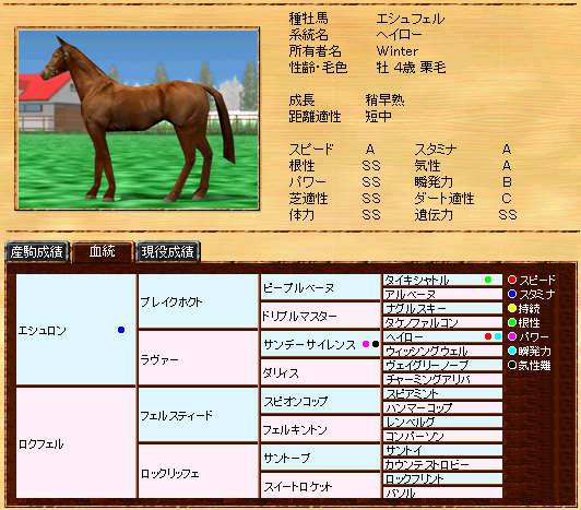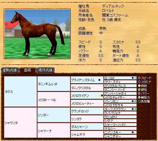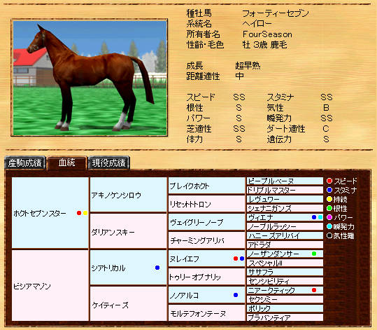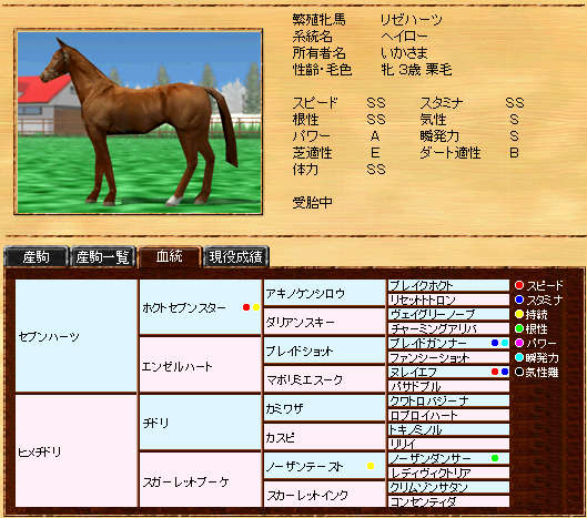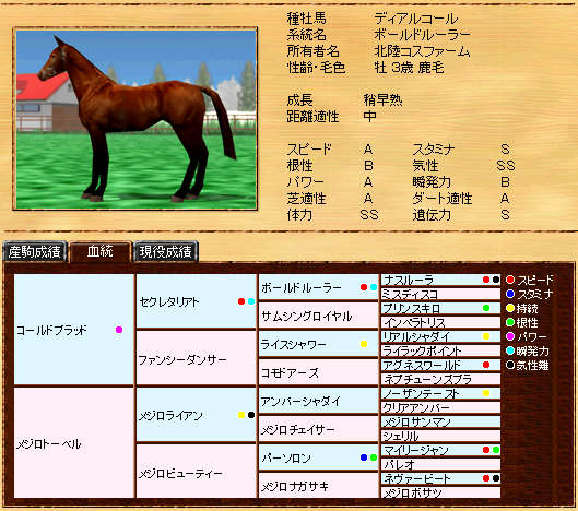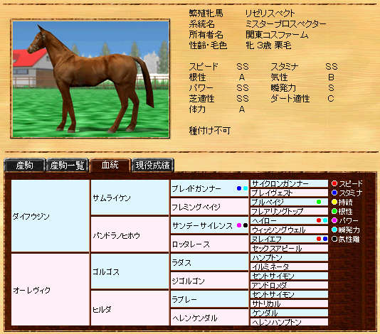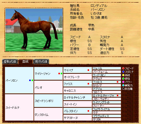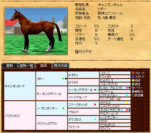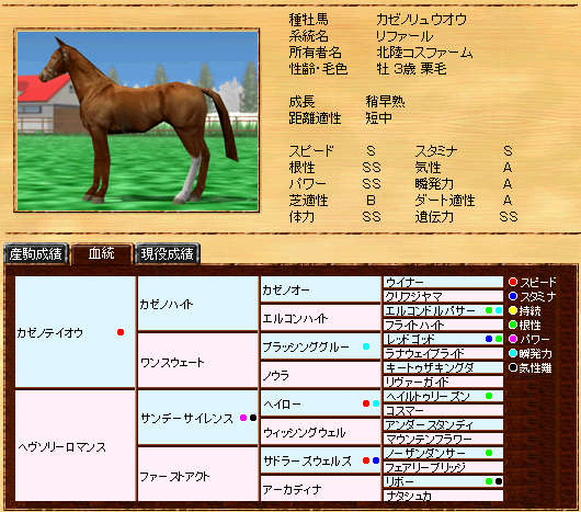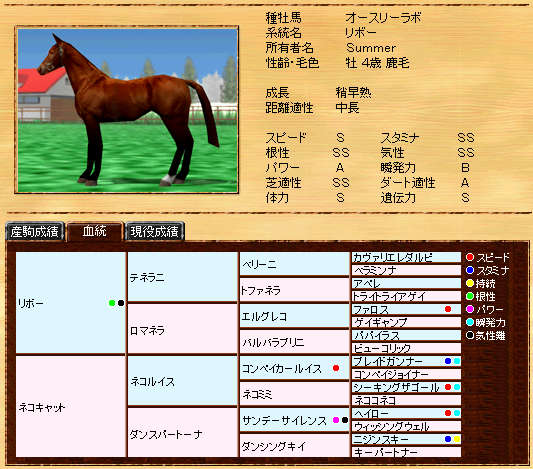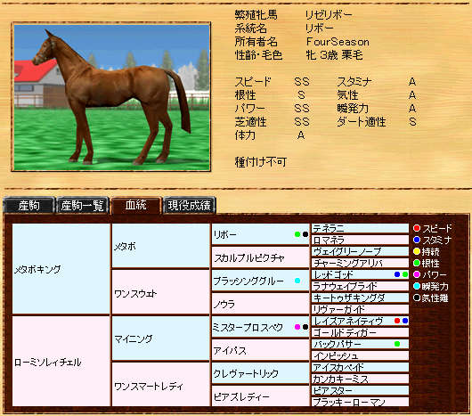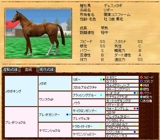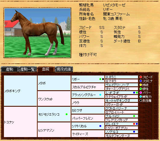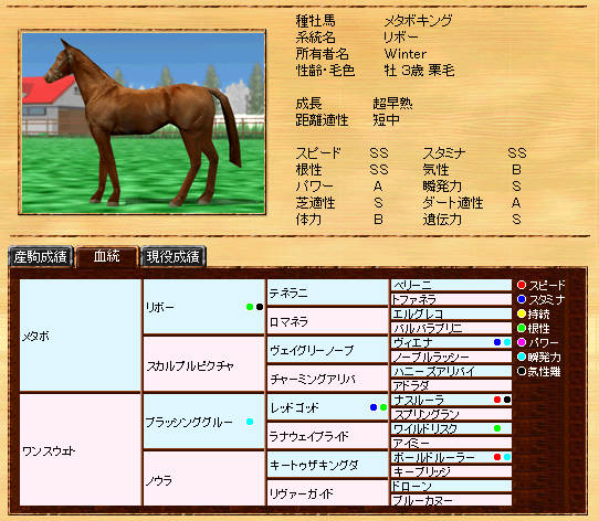 伸び悩んでいたリボー系メタボの自信作です。まだまだ発展途上ですが、種牡馬初年度の13Sは、なかなか安定した産駒を産出できていると思います。また、リボー系では珍しい?超早の短中です。