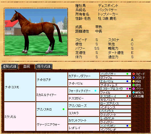 種牡馬交流で誕生したバックパサー系です。今までバックパサー系が居なかったので新たな血流として